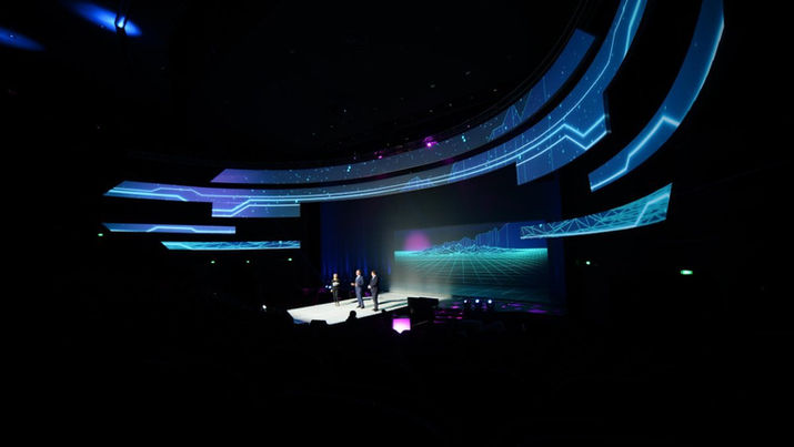 Palais des Congrès de Poitiers, 12 vidéos projecteurs de 14 000 à 20 000 lumens, 12 flux Modulo. Projection sur tulle holographique.
